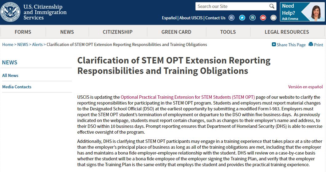 而在近日美国移民局发布的新公告中则针对STEM OPT学生提出新规定。STEM专业类的留学生在OPT(毕业实习)期间若变更雇主,学生和雇主必须尽早通过提交修改后的I-983表格向指定学校职员(DSO)报告信息变更。
